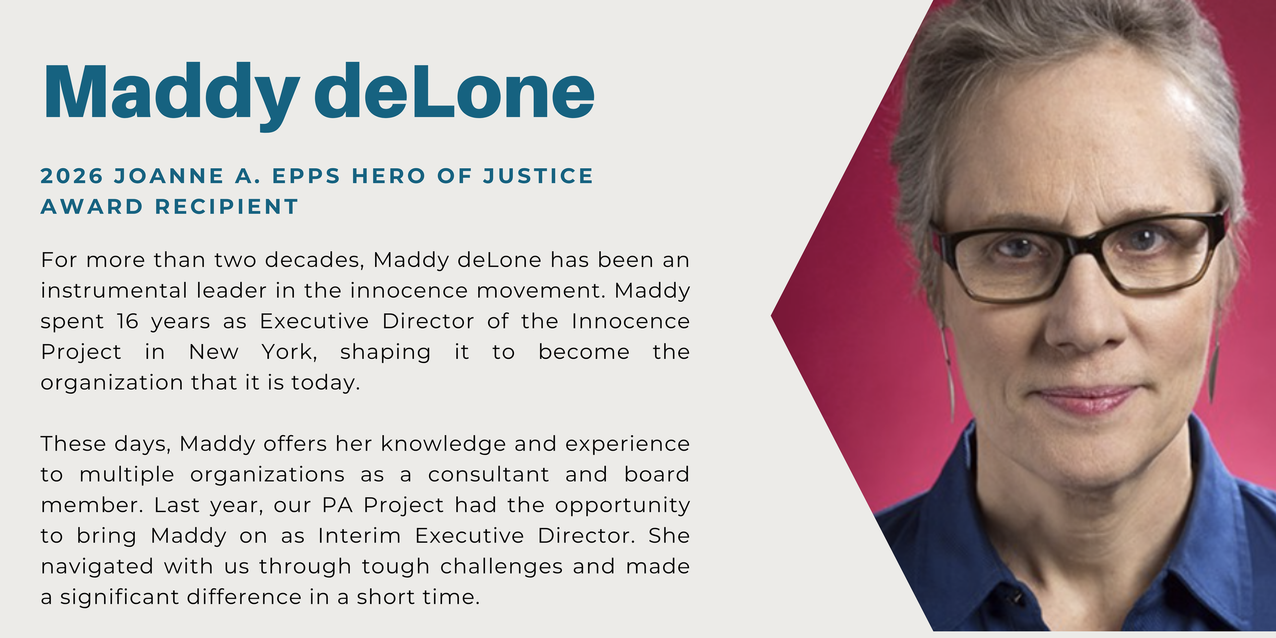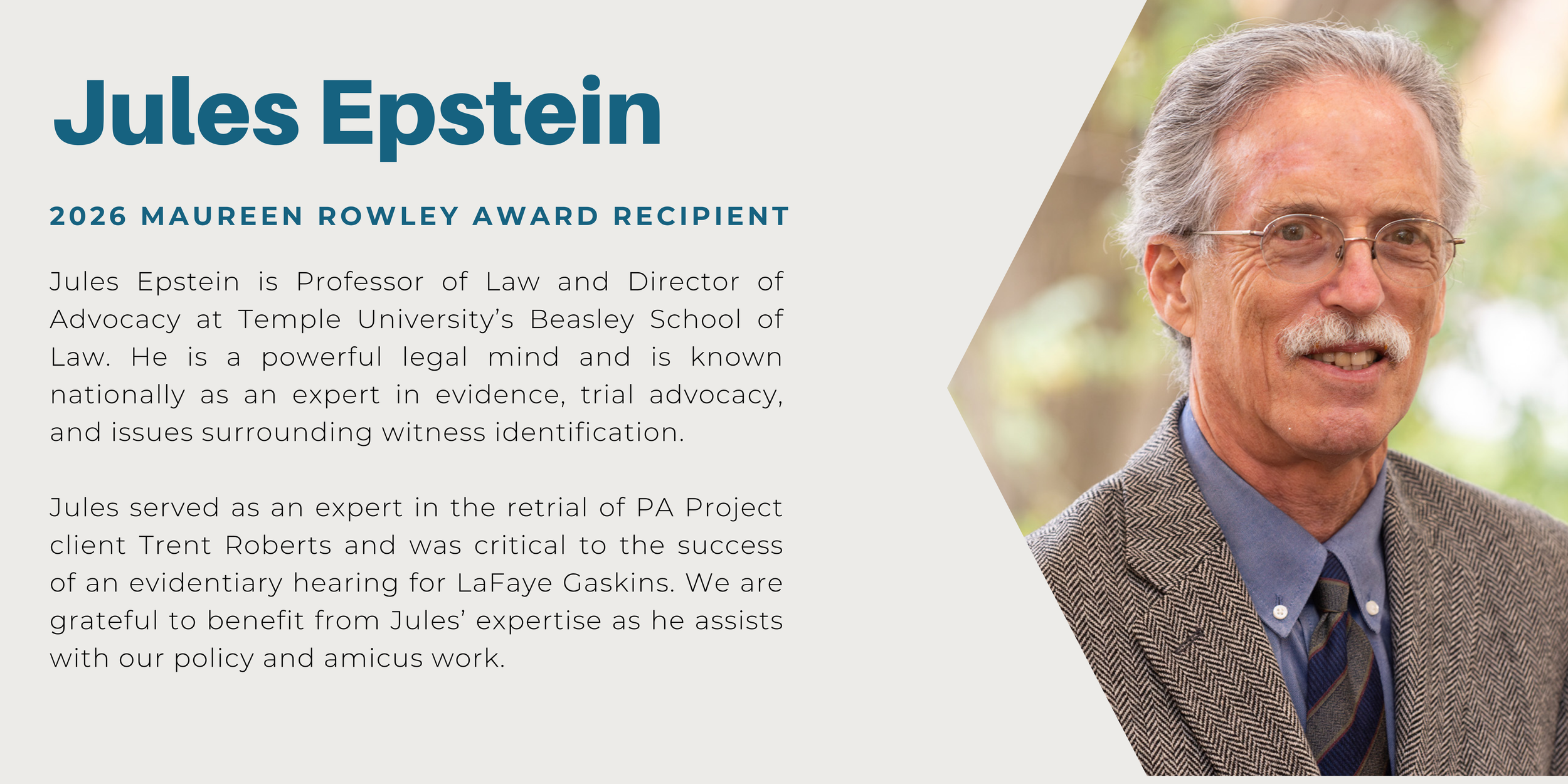 We are delighted to announce this year’s award recipients and highlight the impactful contributions that they have made to the Pennsylvania Innocence Project and the innocence movement.